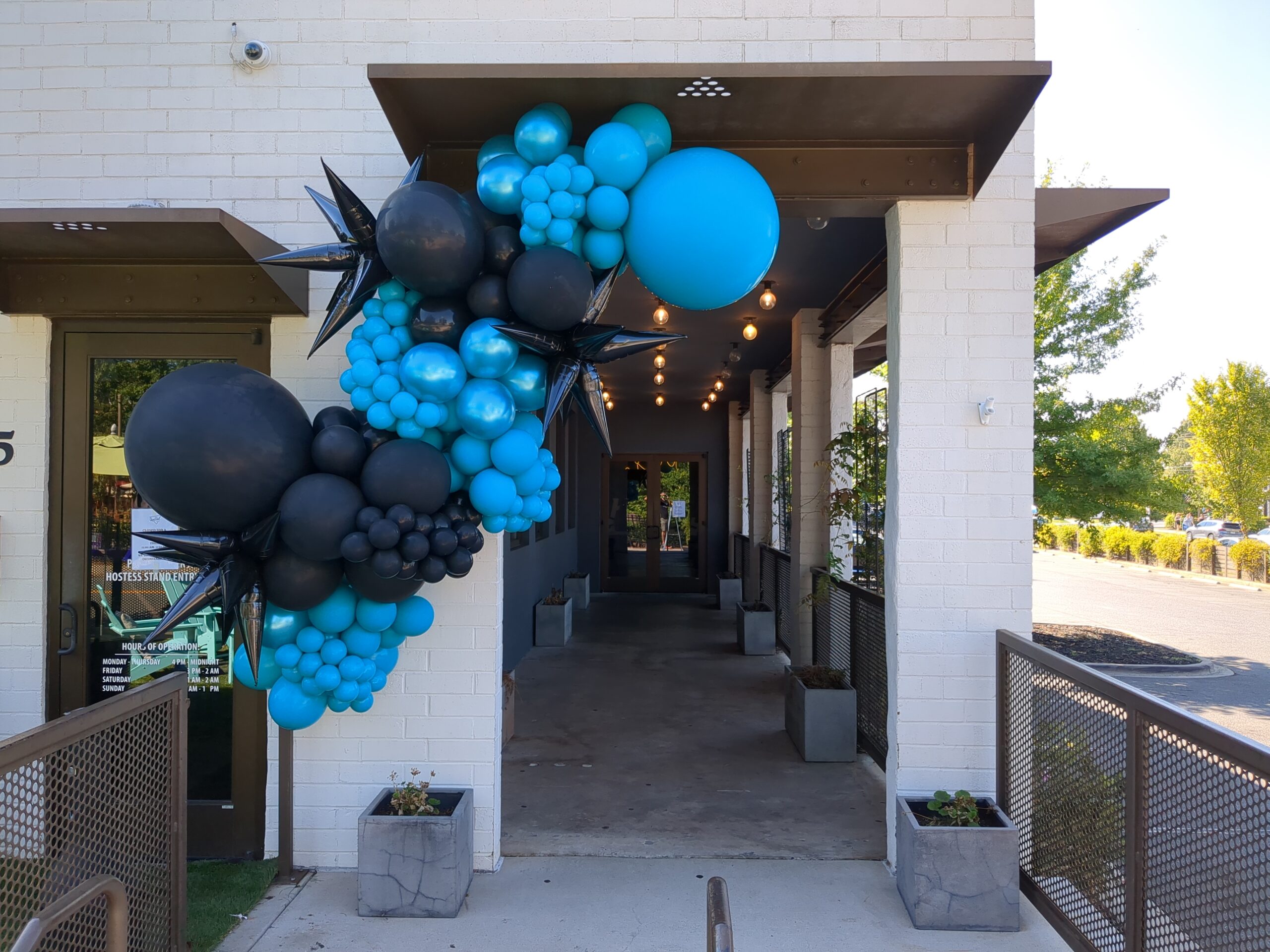 exterior organic balloon garland with starburst and moon accents.