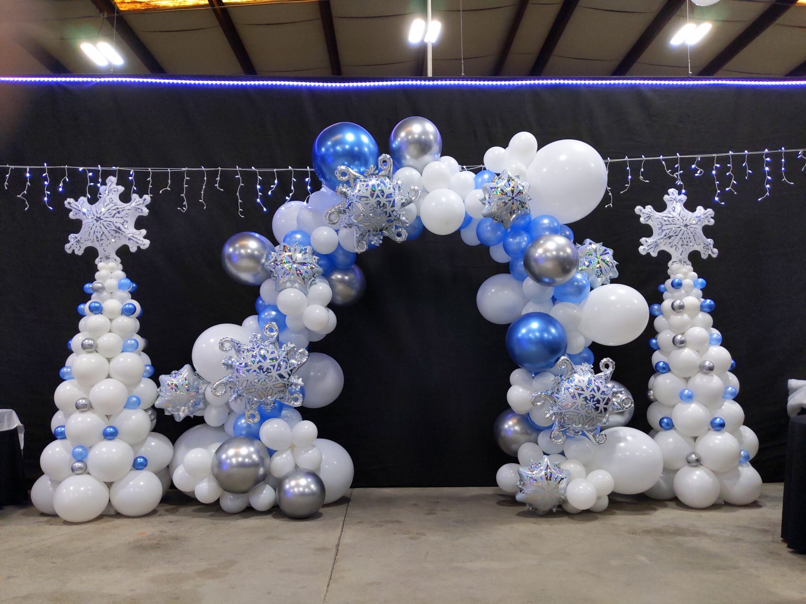 Christmas themed organic balloon arch with snowflake foil balloons.