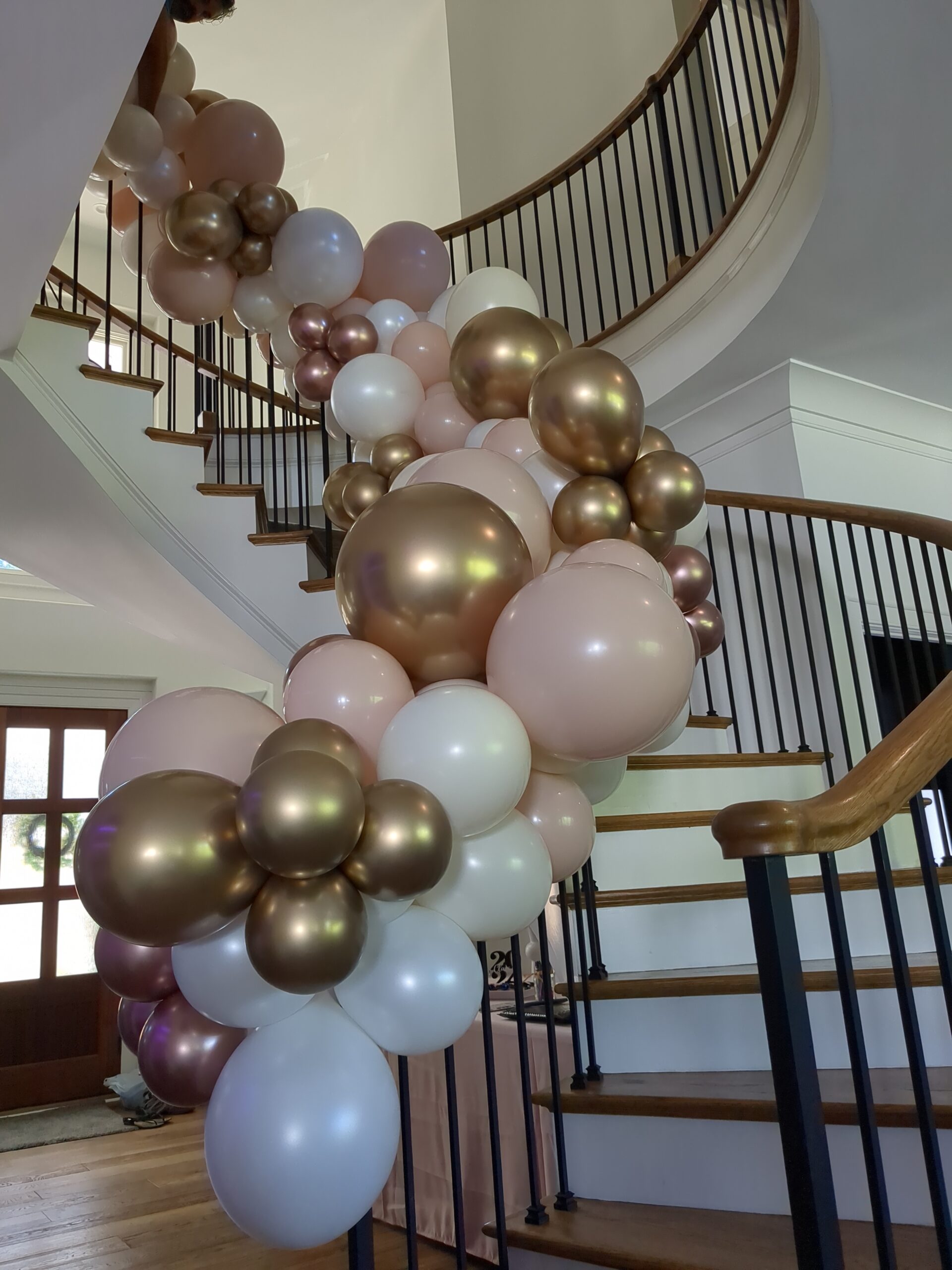 pink, white, and chrome gold organic garland attached to a spiral staircase.