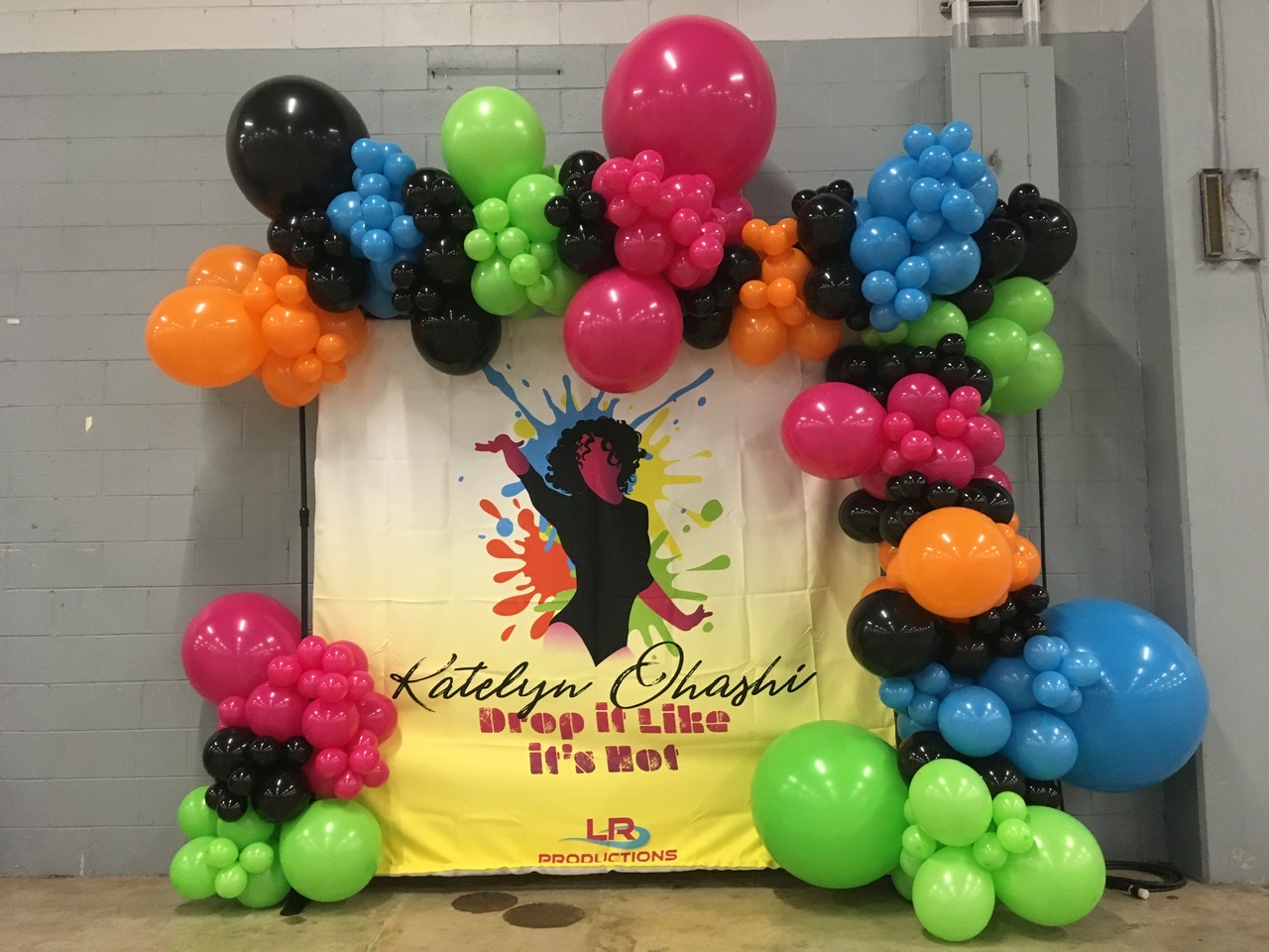 pink, green, orange, blue, and black organic balloon garland on a step and repeat photo backdrop.