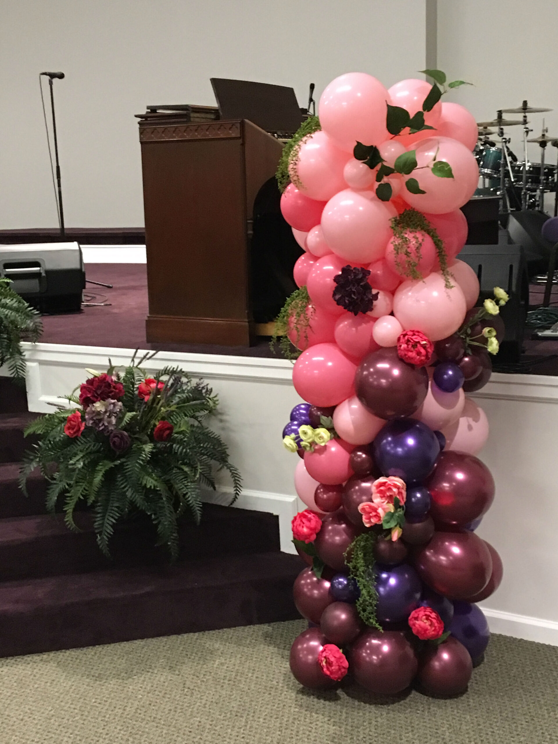 pink and burgundy organic balloon column with floral accents
