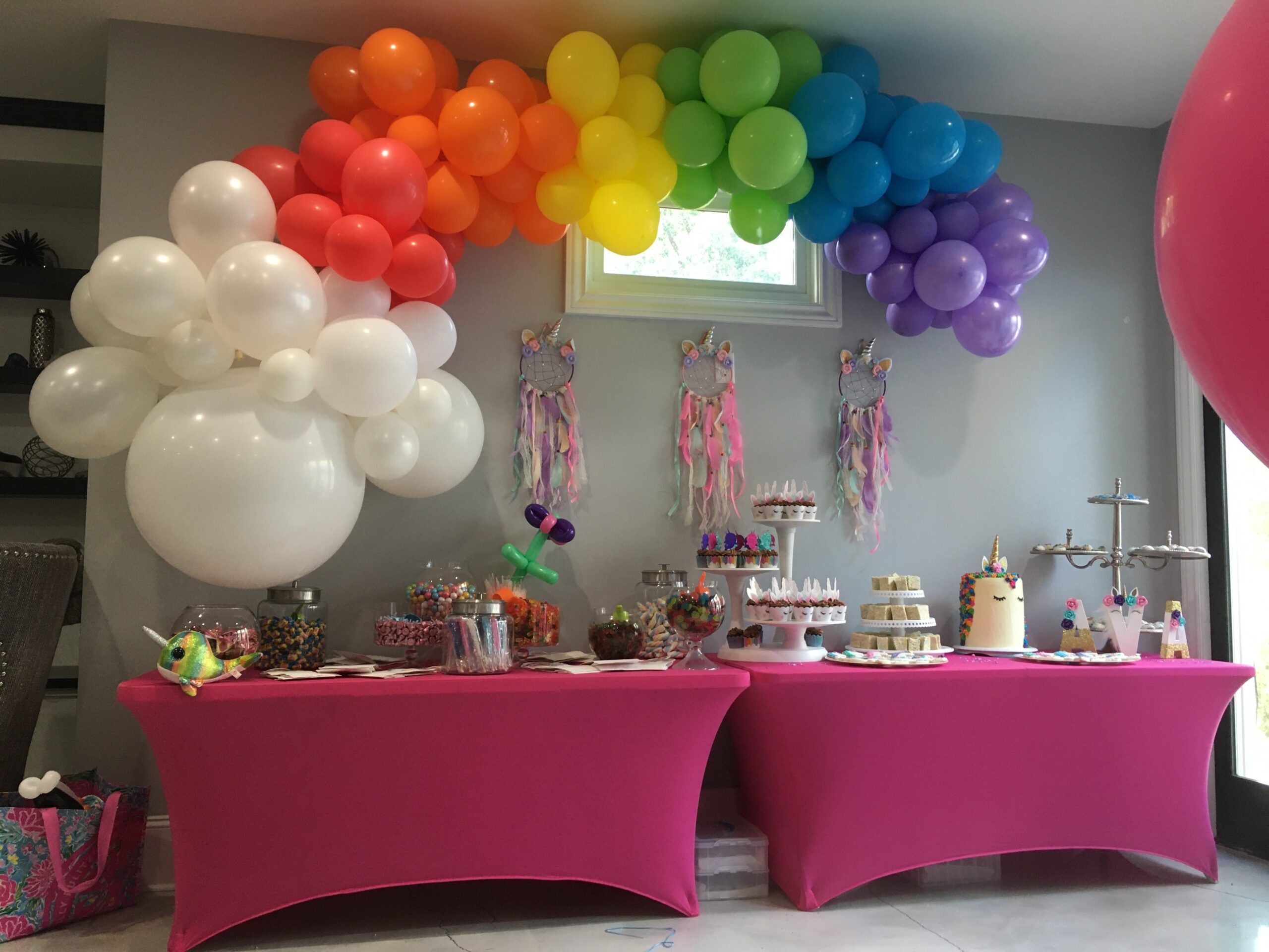 rainbow organic garland over desert table at a birthday party
