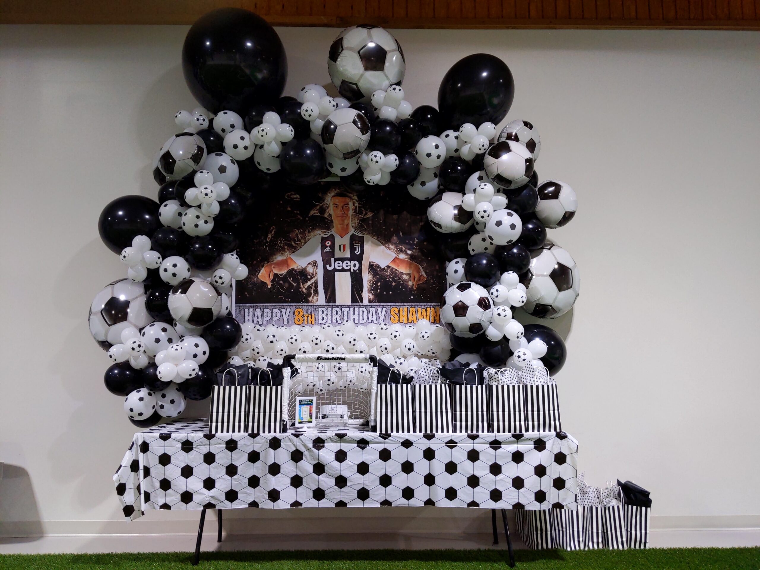 soccer themed organic balloon arches at a birthday party.