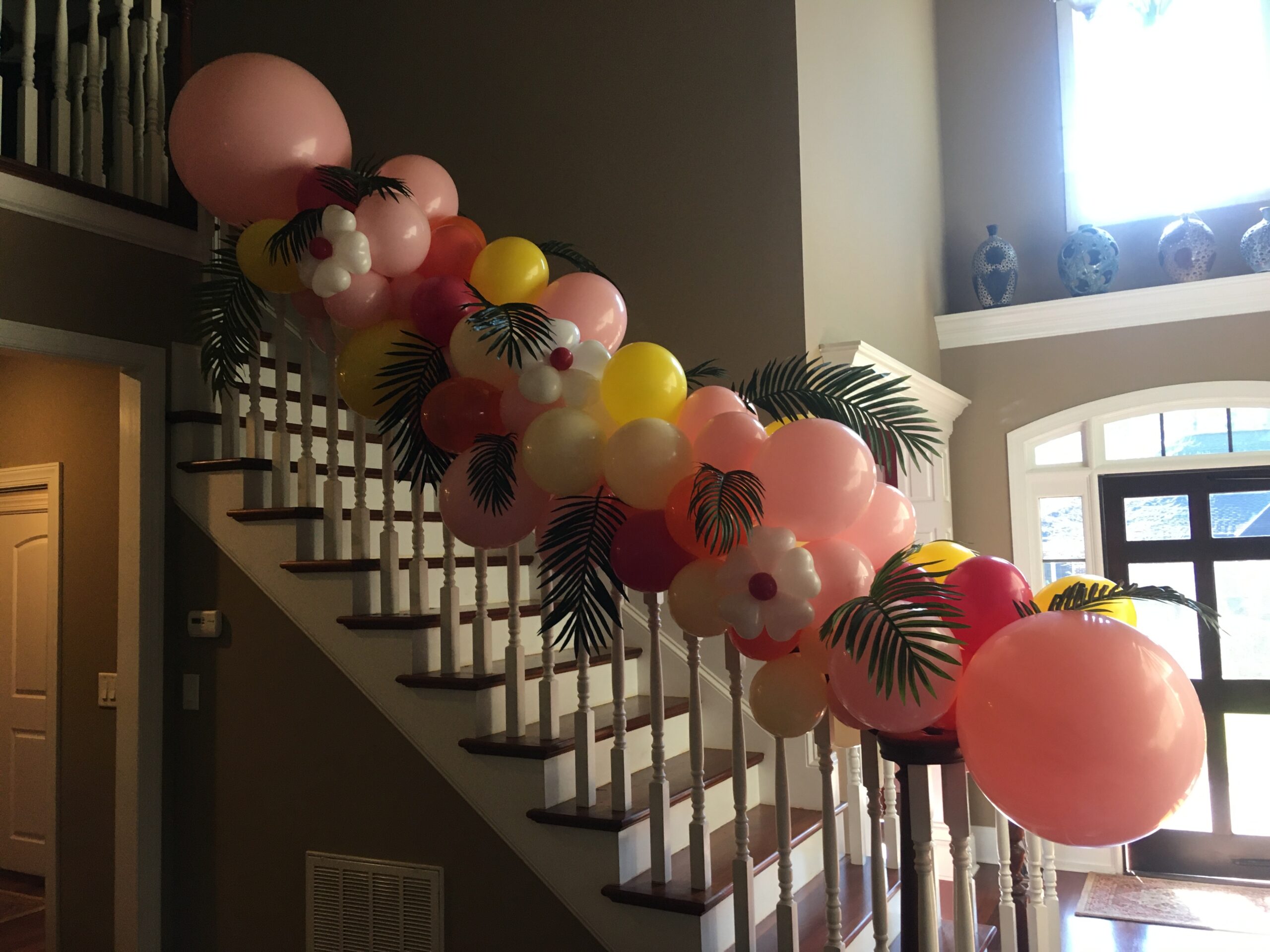 Hawaii themed organic garland attached to a stair banister.