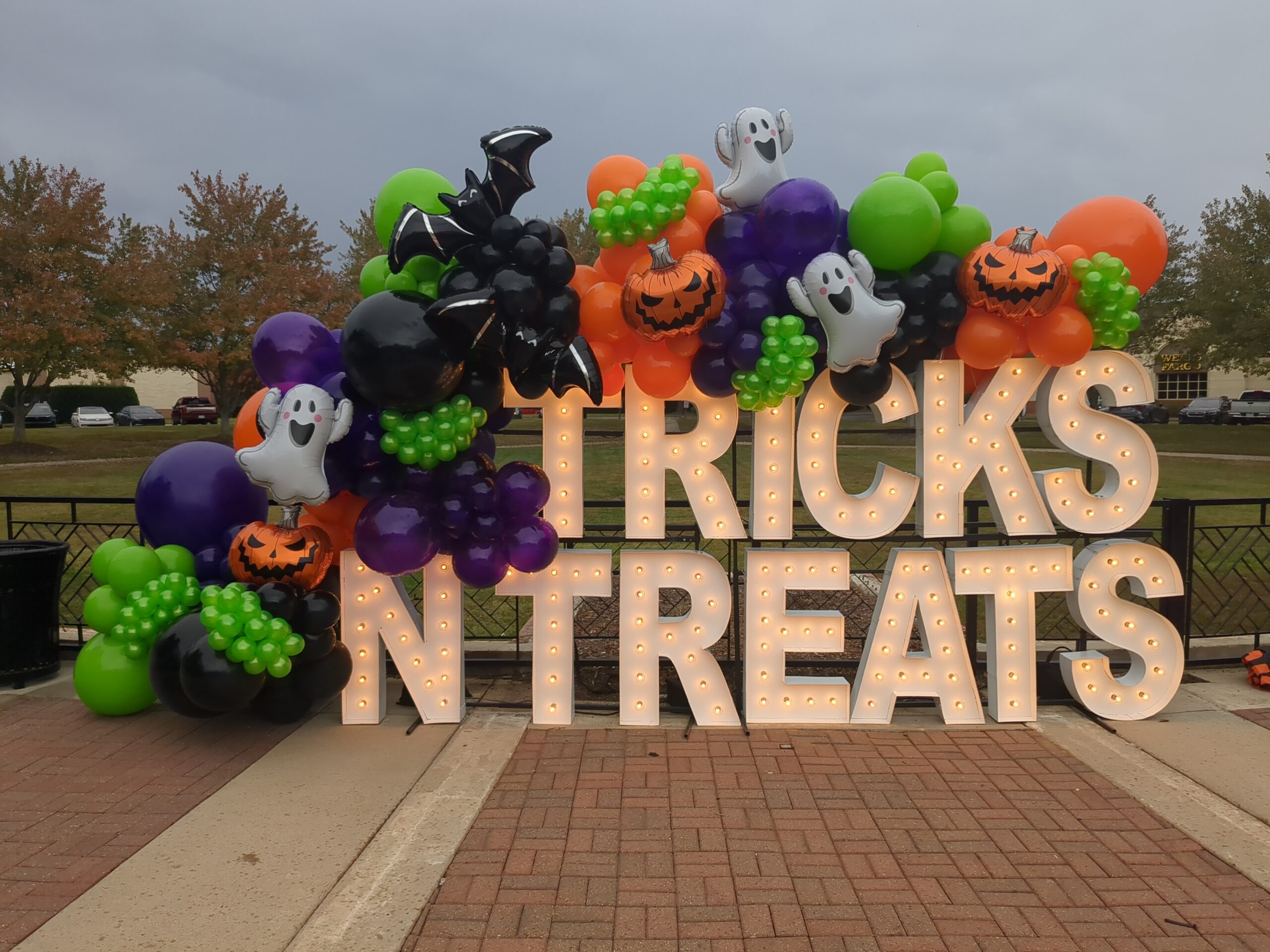 Trick N treat Halloween organic balloon garland on marquee letters in Charlotte, NC